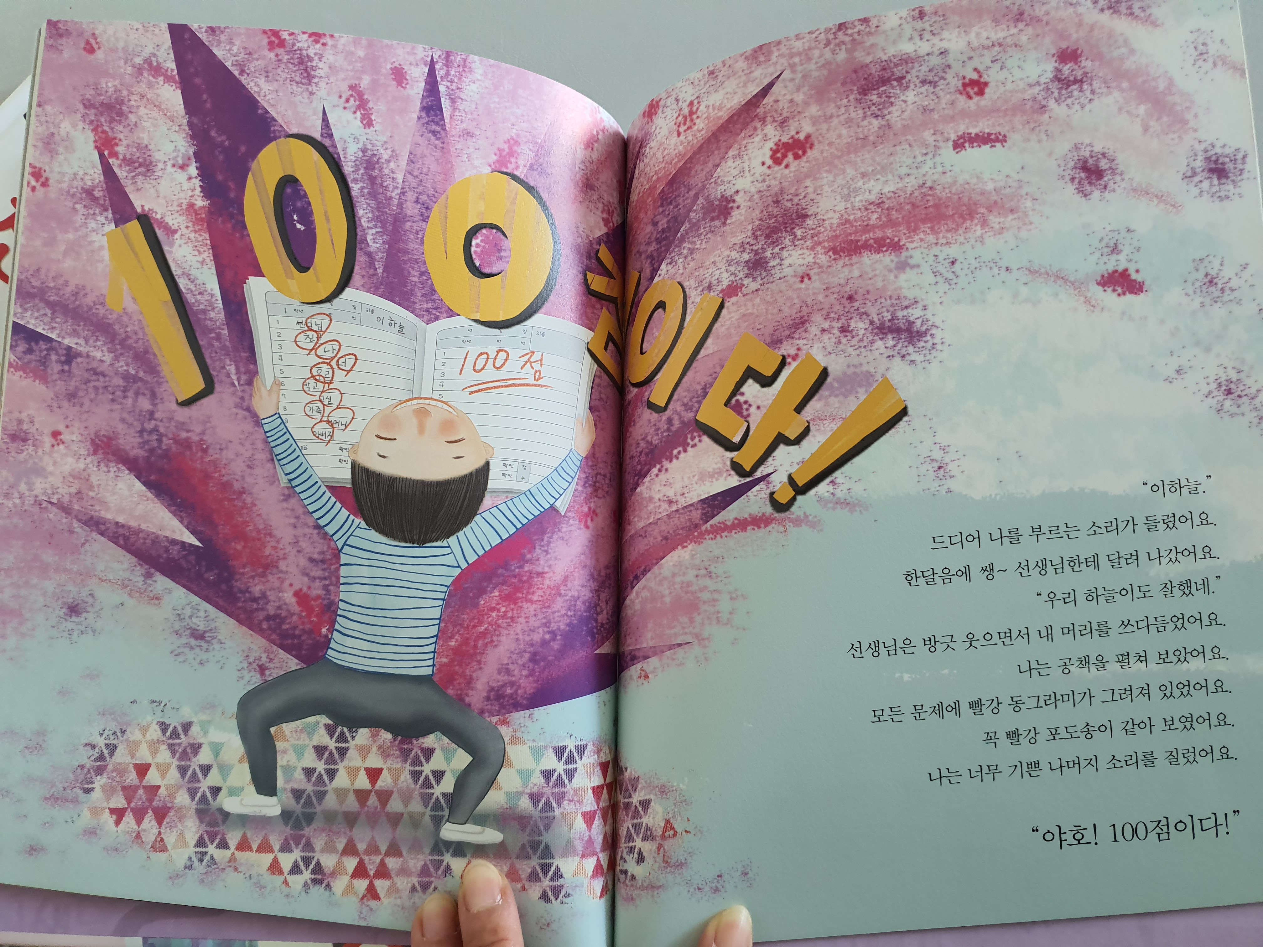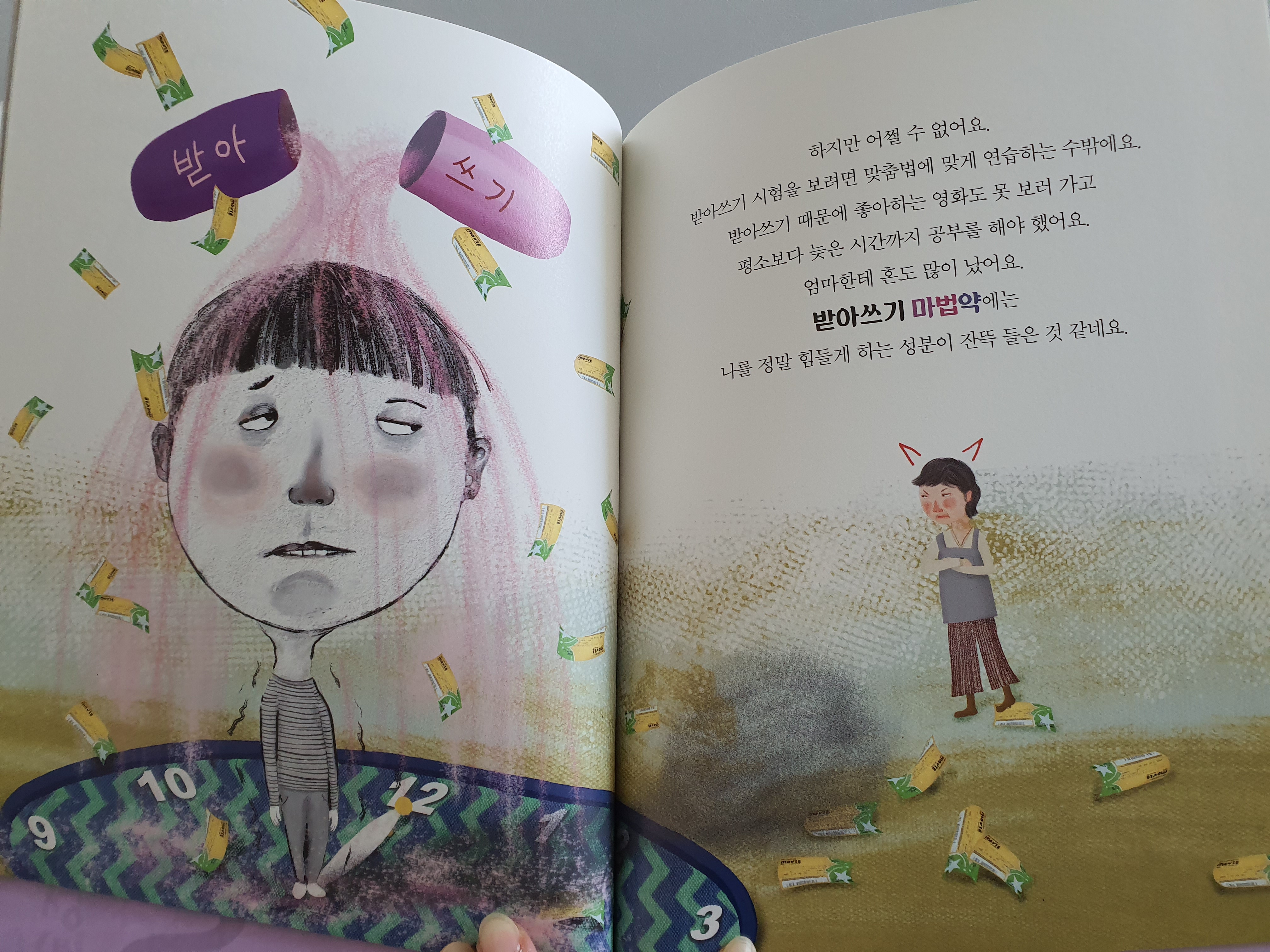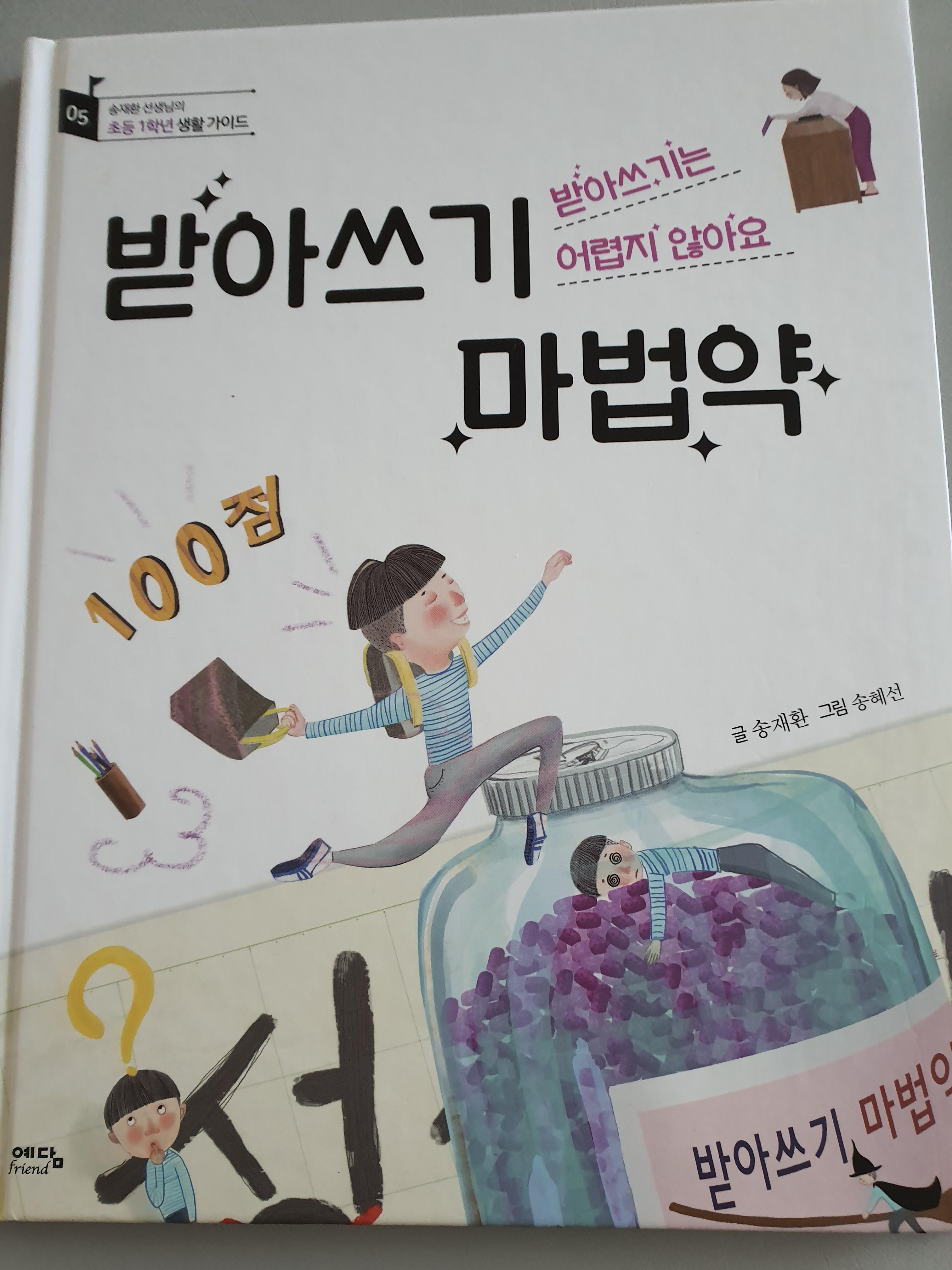 어릴적 기억을 되살려보면 누구나 '받아쓰기'에 대한 공포가 있죠?ㅎㅎ 저만 그런가요 ㅎㅎ 받아쓰기 전에는 늘 두근두근 긴장되었던 기억이 나요. 100점받으면 기분이 너무 좋기도 하고요~ 그런 아이들의 심리를 잘 표현한 책입니다.