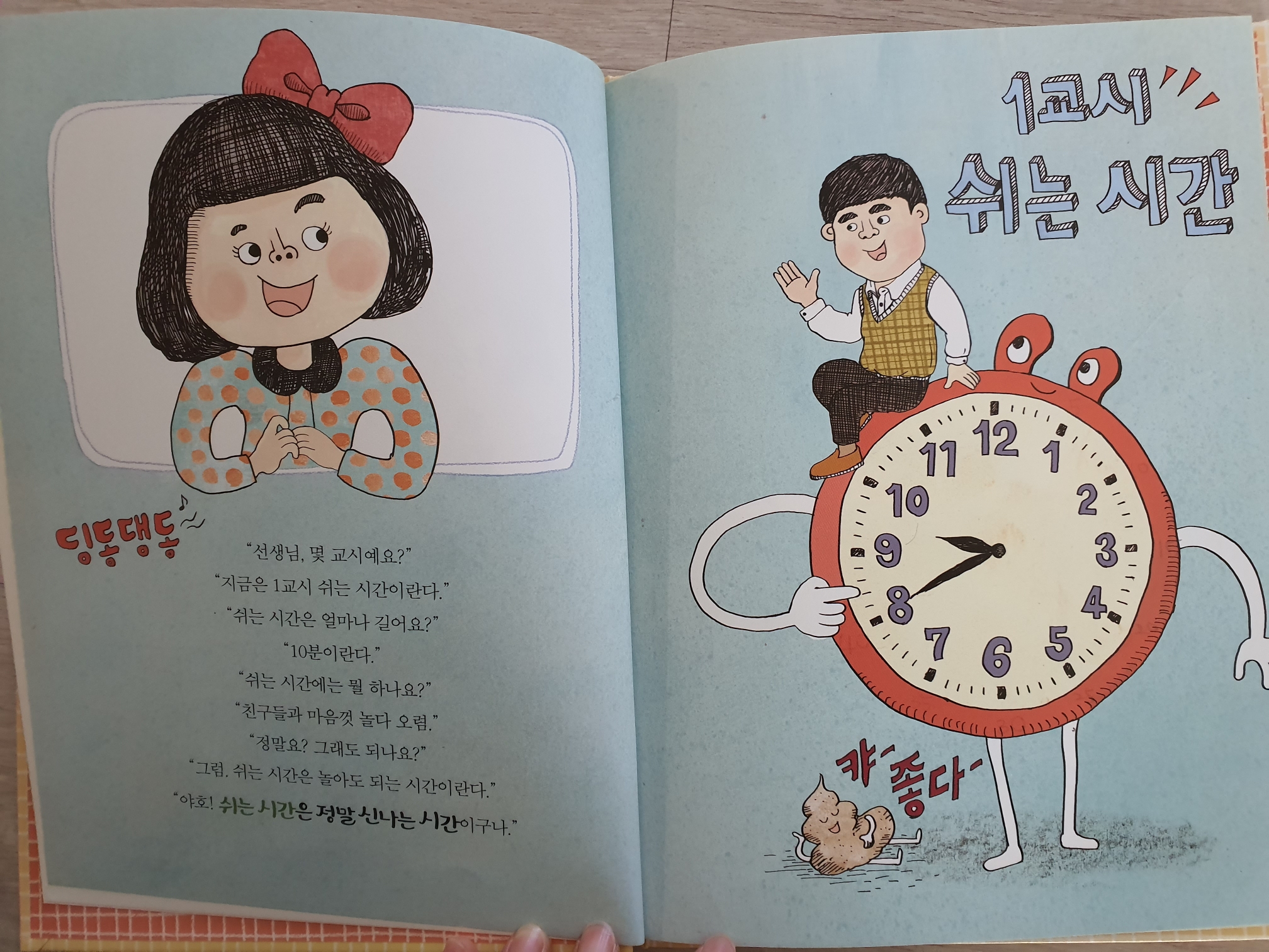 '우리는 호기심쟁이 1학년' 책은 1교시부터 집에 갈때 까지 학교의 일과를 순서대로 써 놓았어요. 40분 수업이고 어떤 과목을 배우고, 쉬는 시간 10분은 화장실에 가거나 친구와 노는 시간이며 다음 수업 교과서를 준비하는 시간이라고 상세하게 알려주요. 이런 것을 처음 경험해보는 저희 아들도 읽다가 아주 흥미롭게 빠져들고 질문을 100개정도 하더라고요^^;; 학교생활이 설레기도 하고 걱정되기도 하나봐요 ㅎㅎ 특히 학교에서는 공부만 하는 줄 알았는데, 쉬는 시간도 있고, 통합과목시간에는 노래도 부르고 그림도 그리고 운동도 하고 놀이도 할 수 있다는 말에 활짝 웃네요 ㅎㅎ