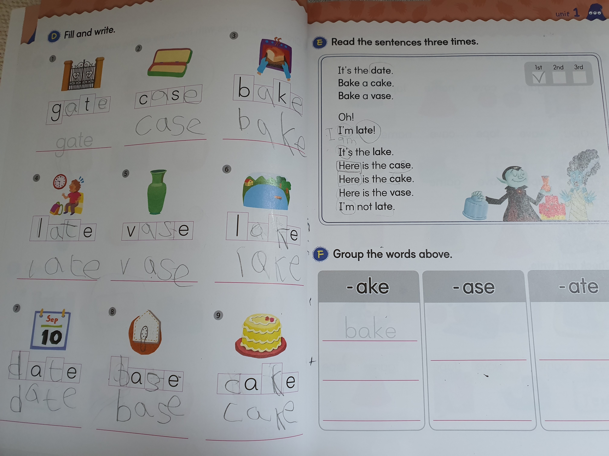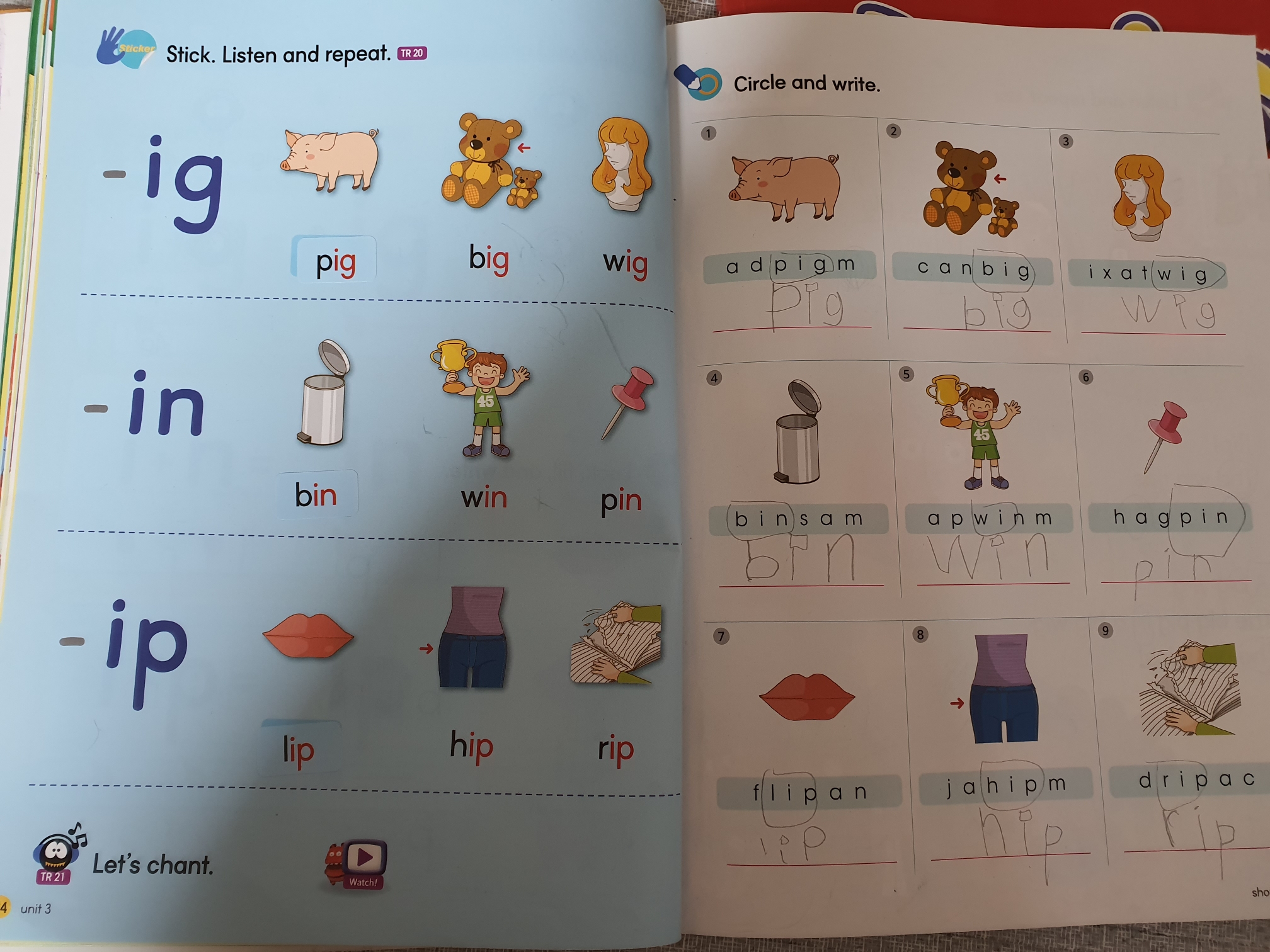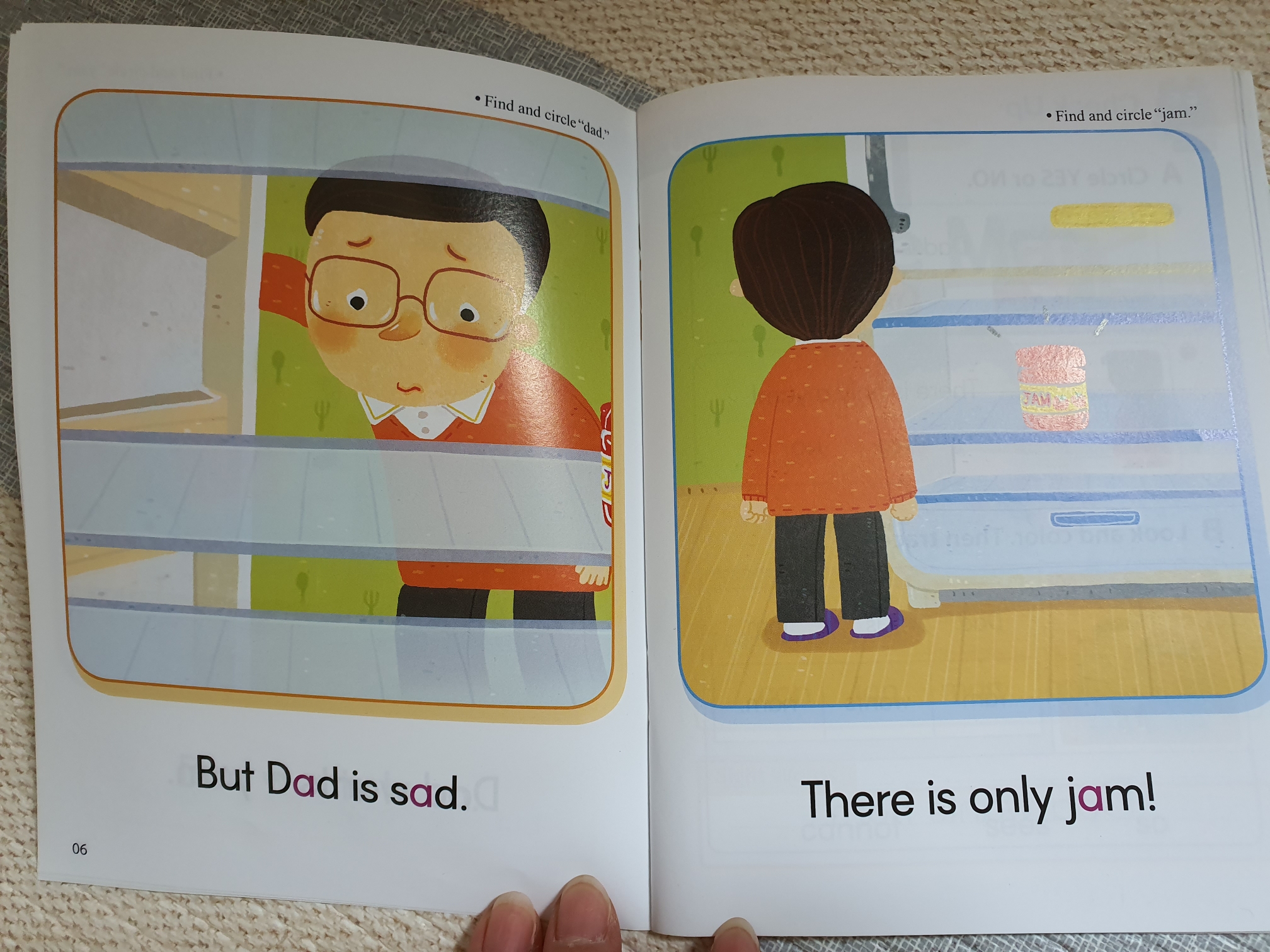 스티커도 붙이고 그림을 보고 스펠링을 찾보고, 배운 단어를 토대로 문장을 읽는 연습을 합니다. 배운 단어와 사이트워드 몇개를 읽으면 하나의 글을 읽을 수 있도록 구성되어 있어서 스스로 읽는 다는 것에 뿌듯해 하더라구요.