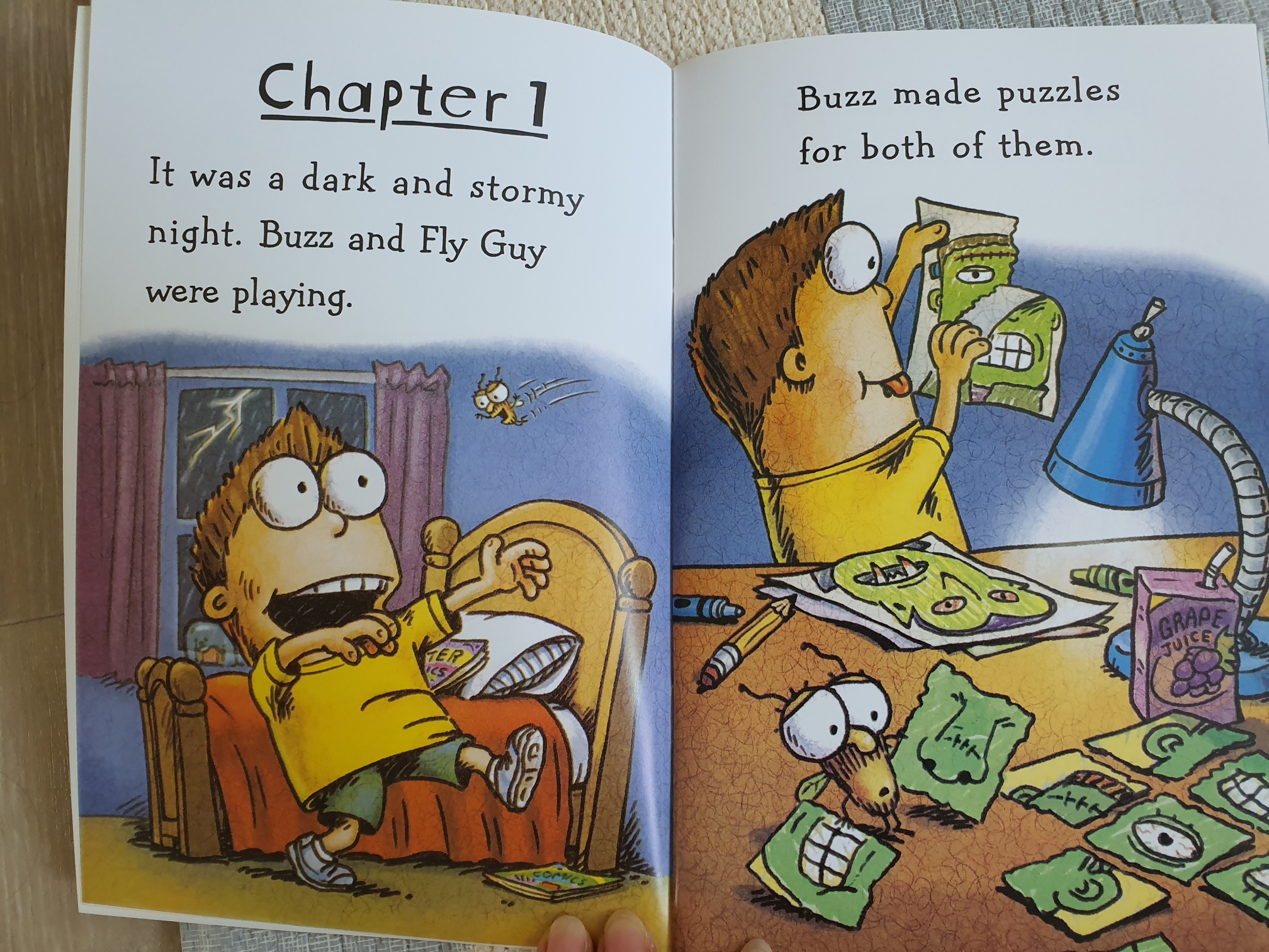 주인공 남자아이 buzz가 어느날 파리를 발견했는데 매우 똑똑한 파리여서 애완파리를 삼으며 이야기가 전개됩니다. 버즈는 파리에게 fly guy라는 이름을 지어주며 집에서 같이 살고 집도 만들어 주고 학교도 같이 데려갑니다. 파리를 애완동물처럼 데리고 다니는 설정이 어른이 봐도 재미있더라고요. 하지만 파리이기 때문에 너무 작아서 차에 같이 탔다가 바람타고 날아가서 트럭 기사 입 속에 들어갔다가 뱉어지기도 하고, 낚시 미끼로 잡힐 뻔도 합니다. 그럴 때 버즈는 플라이가이가 걱정되서 열심히 쫓아가다가 눈물을 흘리며 열기구까지 탑니다. 또 같이 레스토랑에 갔다가 다른 테이블 스프에 들어간 플라이가이를 본 사람들이 놀라서 음식을 엎는 바람에 레스토랑은 난리가 납니다. 학교 식당에 같이 갔다가 식당 직원까지 해고되고요..여러 에피소드가 재미나네요.