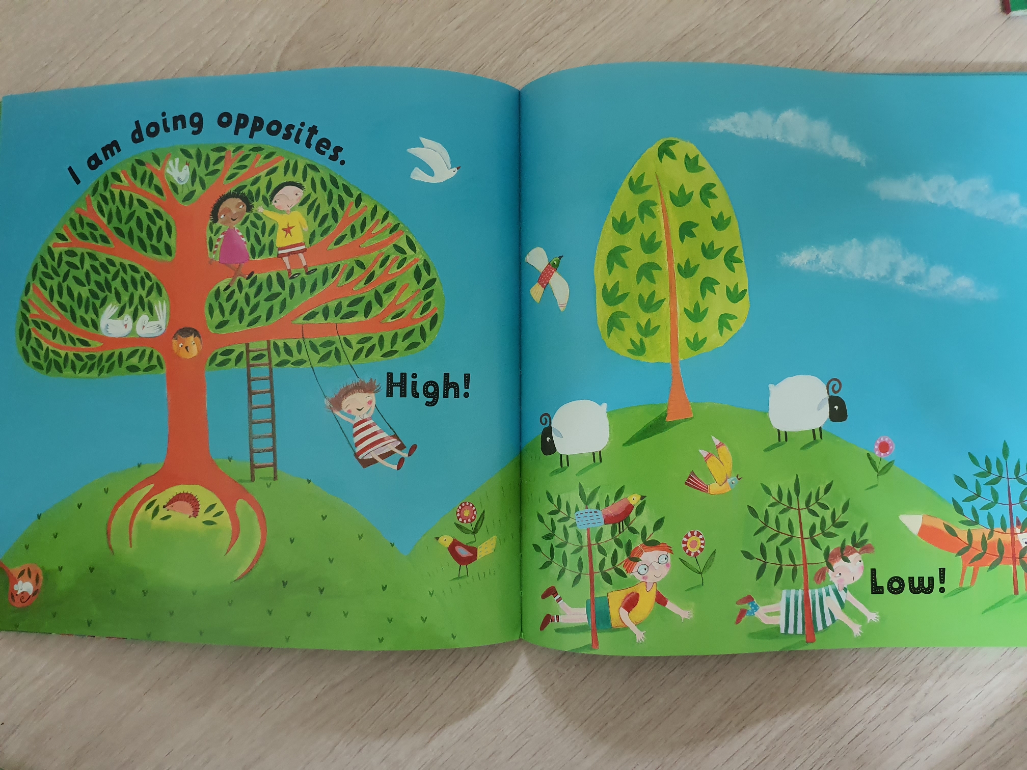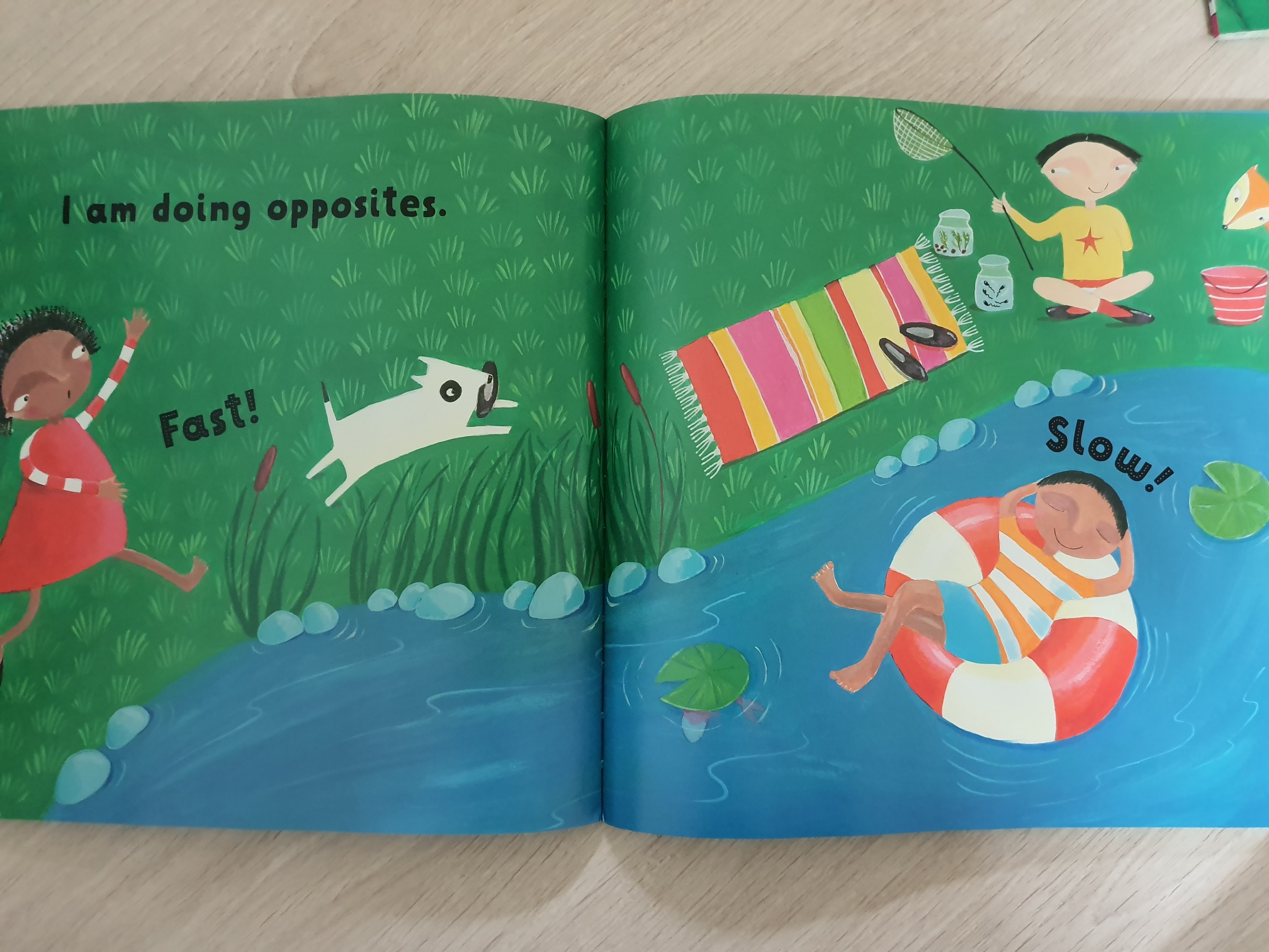 이 책은 글밥도 적은 편이고 반대되는 단어를 익히기 좋아요. 그림만 봐도 무슨 뜻인지 알기 쉽고 노래가 반복되서 몇 번만 들어도 따라하더라고요. 직접 몸으로 fast, slow, run, stop 등 움직이면서 책 보니 즐거워합니다.