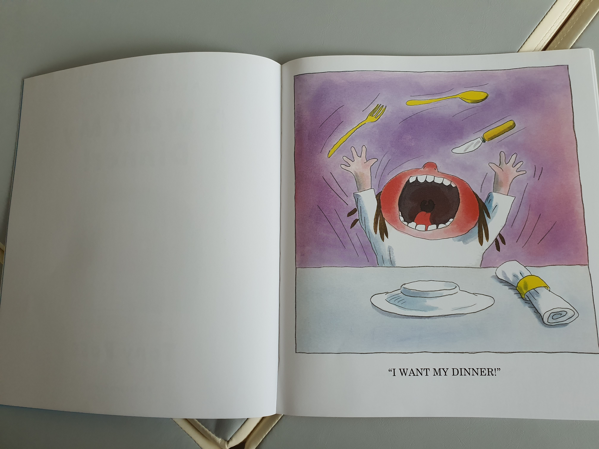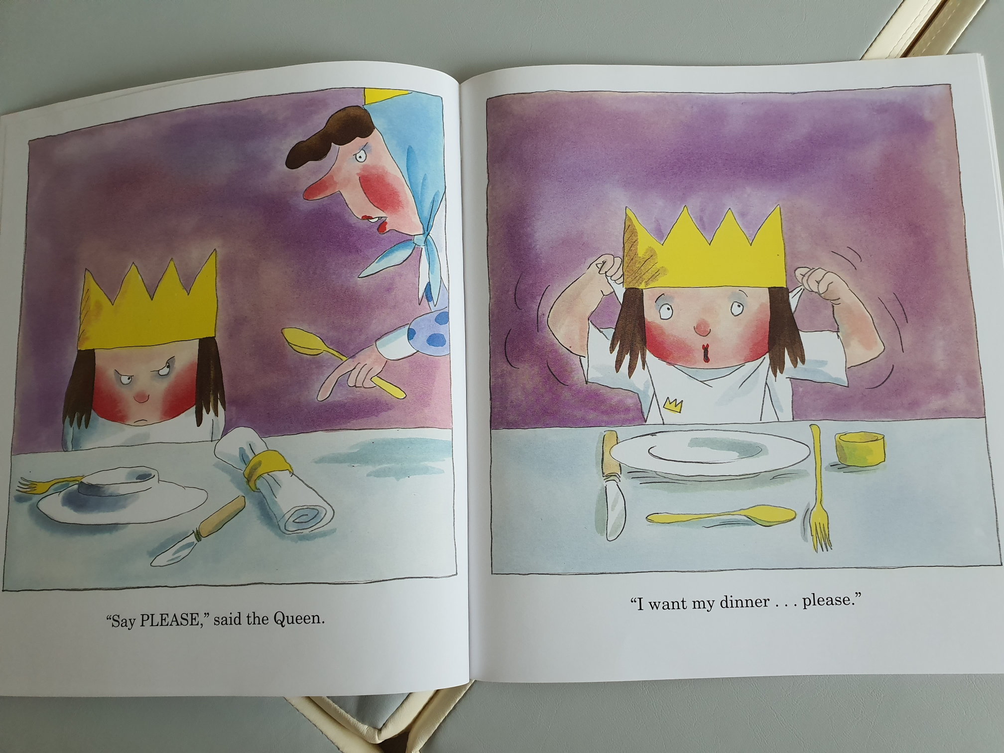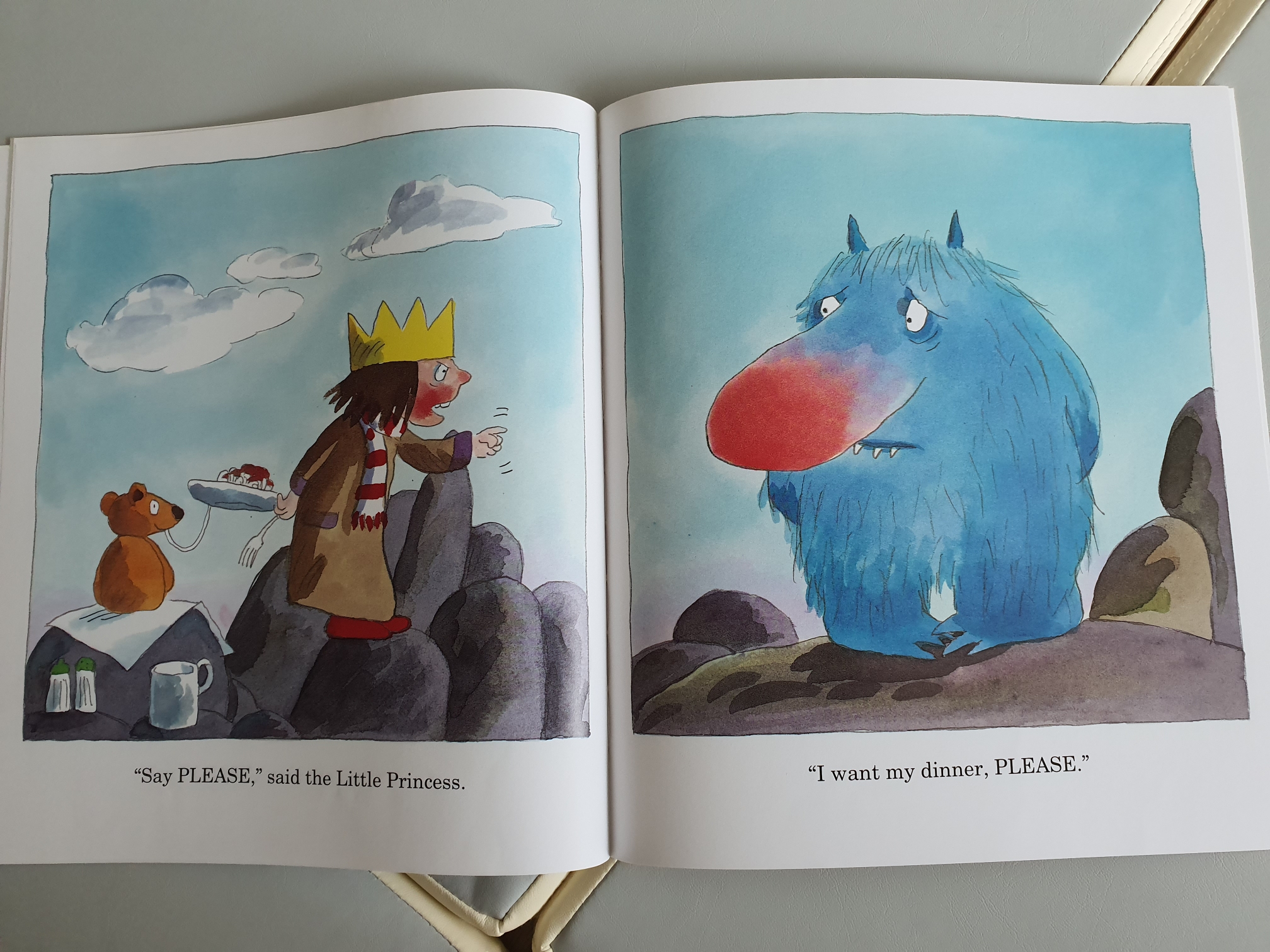 I want my dinner 이 책은 공주가 저녁을 먹겠다고 소리칩니다. 하지만 이 모습이 예의가 없어서 왕비는 "say, please." 라고 이야기합니다. 이후에도 무언가 필요하거나 원할 때 소리치면 모두들 "please"를 붙여서 말하라고 가르쳐줍니다. 어느날 산책을 갔는데 beastie를 만났고 공주가 가지고 온 저녁을 먹겠다고 소리칩니다. 공주는 "say, please." 라고 이야기 하고 beastie는 온순하게 말을 듣고, 돌아 오는 길에도 고맙다고 말해야지! 라며 씩씩하게 가르쳐주고 옵니다.