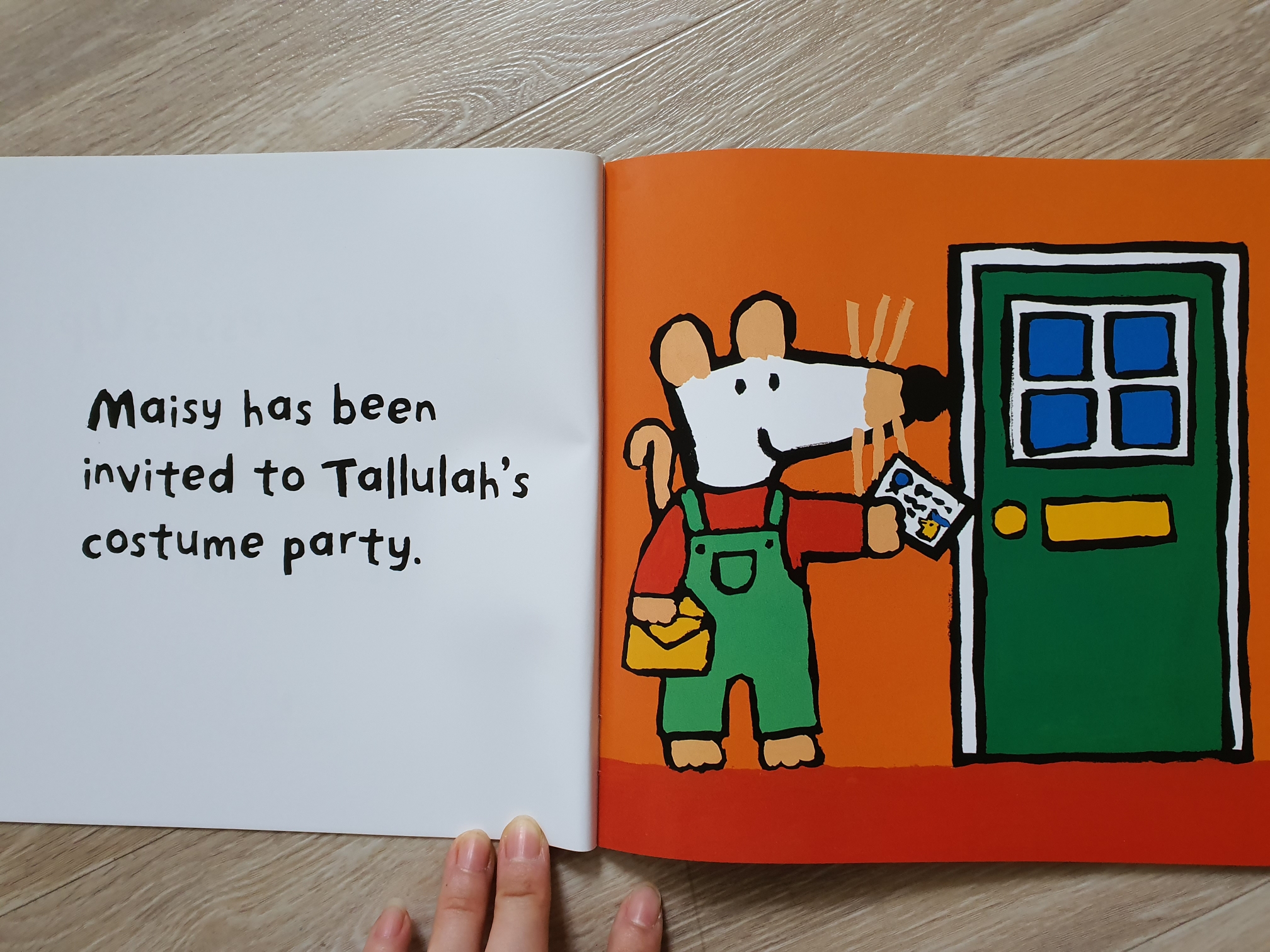 maisy dresses up입니다. costume party에 초대받아서 무엇을 입을지 고민을 하는 메이지입니다. 메이지가 입고 싶은 옷들은 모두 친구들이 이미 입어서 고민이네요. 그러다가 메이지는 자신만의 스페셜한 costume을 만듭니다. 얼룩말로 변신해서 친구들과 재미있게 노네요^^
