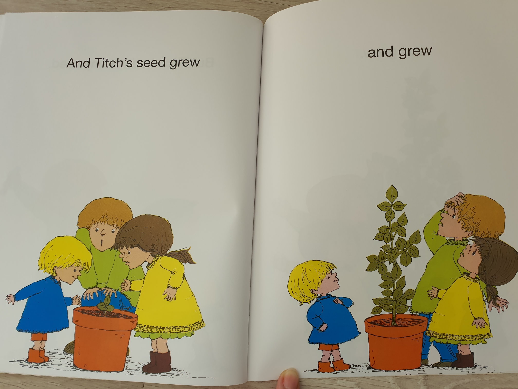 하지만 titch가 가지고 있는 작은 씨앗이 쑥쑥 자라서 언니와 오빠보다 커졌어요~ titch의 표정은 아주 뿌듯해보여요~ 저까지 뿌듯하네요. 저도 동생이었어서 titch의 마음이 아주 잘 이해가 되요^^ 둘째자녀를 위해 읽어주면 아이 마음이 공감되면서 이해받는 기분이 들 것 같아요~~