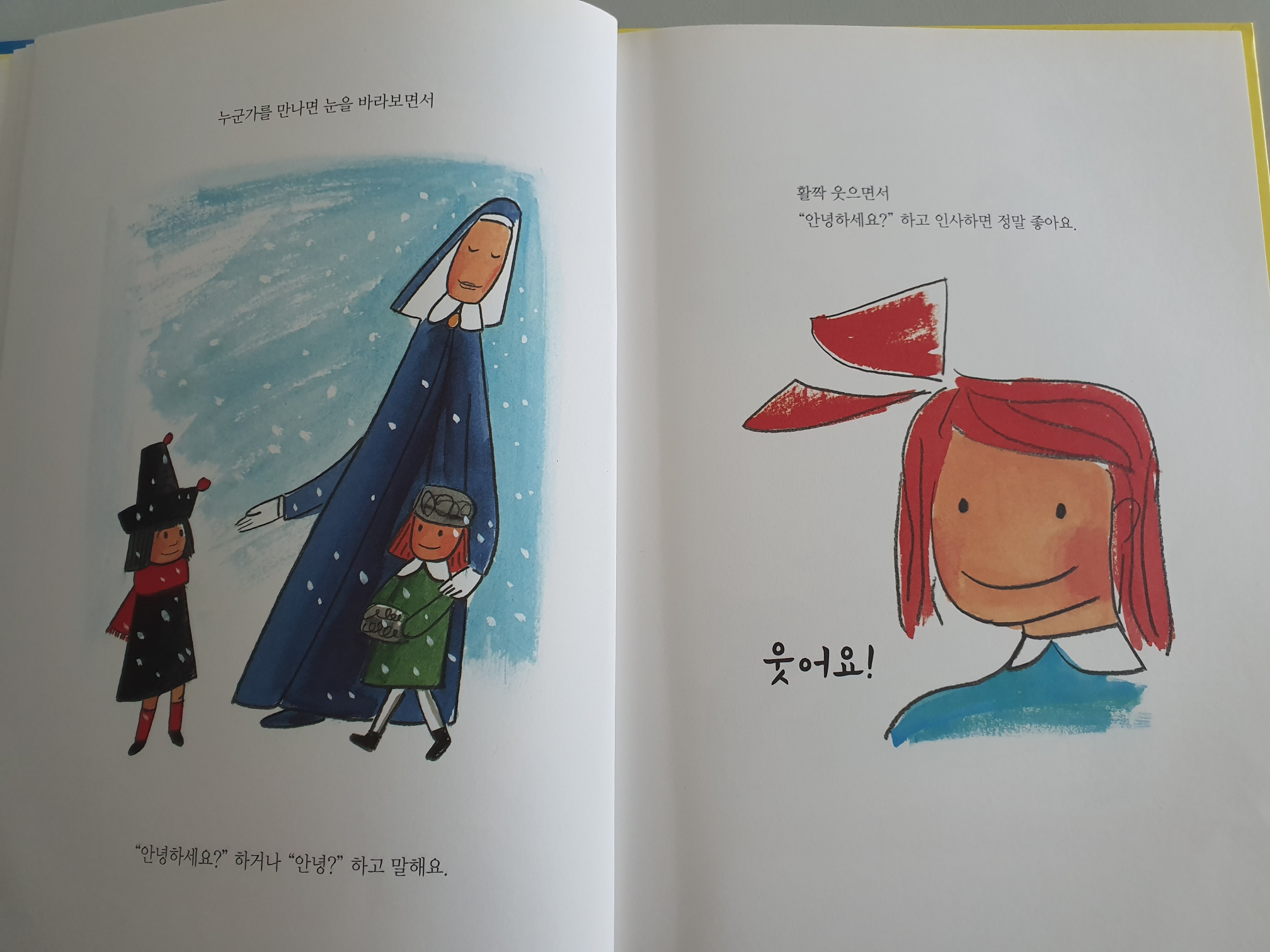 아이를 키워보니 기본적인 예의나 예절은 자동으로 익히기를 기다리는 것 보다 알려줘야 하더라고요. 이럴때는 이렇게 말하고 행동하는 거라고.. 그렇지 않으면 밖에서 행동할 때 몰라서 예의없게 행동하는 경우가 종종 있어요. 그래서 평소에 이런 동화책을 읽어주면 엄마의 잔소리가 아닌 책 내용이니 아이가 더 잘 이해하는 것 같아요~~ 그래서 엄마인 제가 더 좋아하는 책이에요ㅎㅎ한동안 안 읽어 줬으니 오늘 오랜만에 읽어주며 인성교육 해야겠어요ㅋㅋ