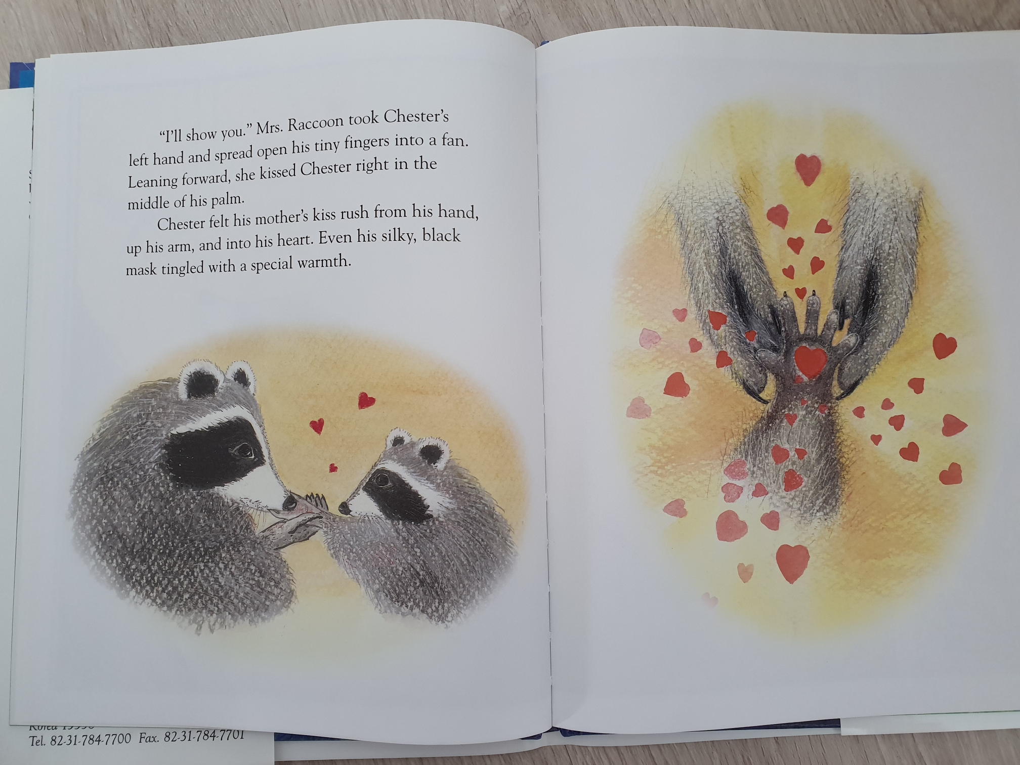 "엄마는 체스터의 왼손을 잡고 작고 귀여운 손가락을 활ㄹ짝 펴게 만들었어요. 엄마는 몸을 앞으로 숙여 체스터의 손바닥에 뽀뽀를 했어요. 엄마의 뽀뽀는 체스터의 손에서부터 팔을 타고 가슴까지 전해졌어요. 이어서 체스터의 부드럽고 까만 얼굴까지 엄마의 특별한 온기가 전해졌어요."